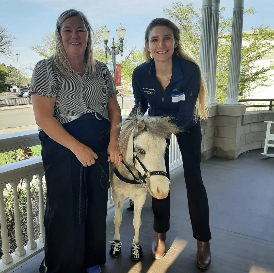 Mane in Heaven is a wonderful organization! Everything started with my mother. When I was a third year medical student. She was working in the office at the farm where Mane in Heaven trains and cares for the miniature therapy horses. The leaders of Mane in Heaven were looking for volunteers to help with a few training exercises. My mom saw volunteering as an opportunity to help me take a break from studying. Once I met the horses and volunteers, I knew I wanted to work with their organization. Animals can connect with people in a unique and special way that even a great therapist is unable to replicate. After matching with my residency training program, I quickly found support from my attending psychiatrists and other team members. The wonderful volunteers of Mane in Heaven were enthusiastic partners! After a couple of years, they were able to begin regular visits to our inpatient unit and every Advocate Aurora Healthcare location. One of my favorite parts of the visits was to see the reaction of the patients and staff when they met the miniature therapy horses. It gave the patients and staff a fun, shared experience. How many people meet a miniature horse wearing tiny, custom gym shoes in a hospital? There was almost always laughter and happy conversation, sounds we don’t always get to hear from patients receiving care on an inpatient unit. The horses are trained to be friendly and affectionate. The volunteers are excellent, answering questions and encouraging participation. My other favorite part of the visits was seeing the sickest patients connect with the miniature therapy horses. One memory that stands out was seeing a recently catatonic patient walk with the miniature horses and smile. It was incredibly powerful!